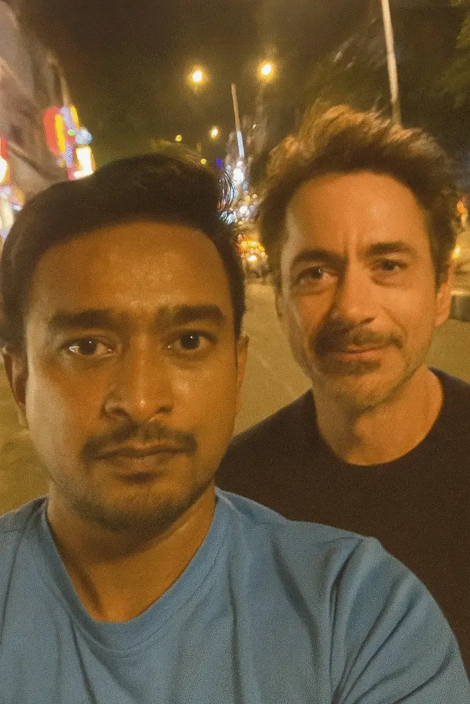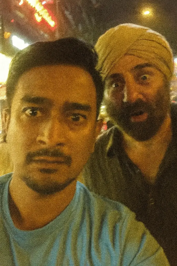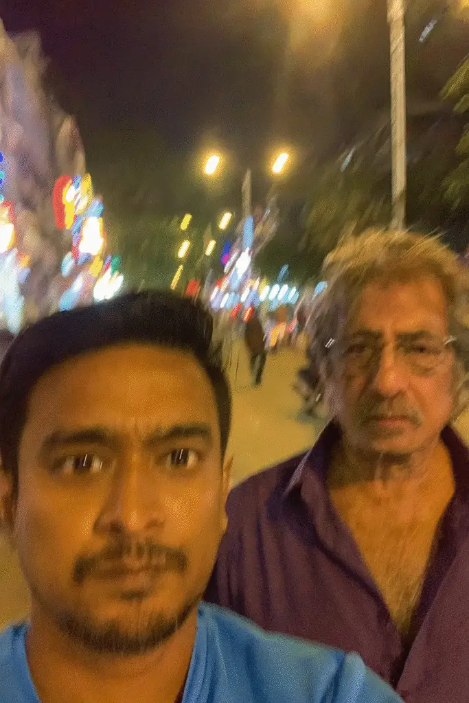 An awkward and spontaneous iPhone selfie taken on a noisy city street at night. The image features a South Asian man and [Nawazuddin Siddiqui] standing together in a casually captured moment. The selfie is poorly composed, off-center, and taken with one hand as if the phone was pulled out suddenly. The South Asian man's appearance — including his exact facial features, hairstyle, skin tone, beard style, expression, and head angle — must be identical to the uploaded image, without any alterations or AI modifications. His outfit and body posture should also match the uploaded photo exactly. The lighting should be uneven and imperfect, with some areas overexposed due to streetlights or neon signage. The background must show a chaotic, blurred, urban Indian night street scene with glowing neon signs, moving traffic, cars, and pedestrians passing by. [Nawazuddin Siddiqui] should be standing naturally beside the person, caught mid-expression with a candid, relaxed, or surprised look — reflecting a truly imperfect and unfiltered moment. The overall image must look grainy, low-quality, slightly motion-blurred, and casual — as if it was taken accidentally on an iPhone without preparation, fully embracing real-world flaws.